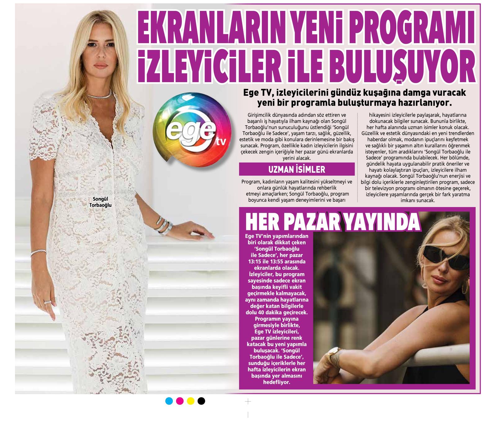 Ege TV, gündüz kuşağında izleyicileriyle buluşturacağı “Songül Torbaoğlu ile Sadece” programıyla büyük bir fark yaratmaya hazırlanıyor. Girişimcilik dünyasında adını sıkça duyduğumuz başarılı iş kadını Songül Torbaoğlu’nun sunduğu bu program, kadınların günlük yaşamlarında ilgi duydukları yaşam tarzı, sağlık, güzellik, estetik ve moda gibi pek çok konuyu kapsayacak. Her Pazar günü izleyicileriyle buluşacak bu özel program, kadınların yaşam kalitesini artırmayı ve onlara rehberlik etmeyi amaçlıyor.